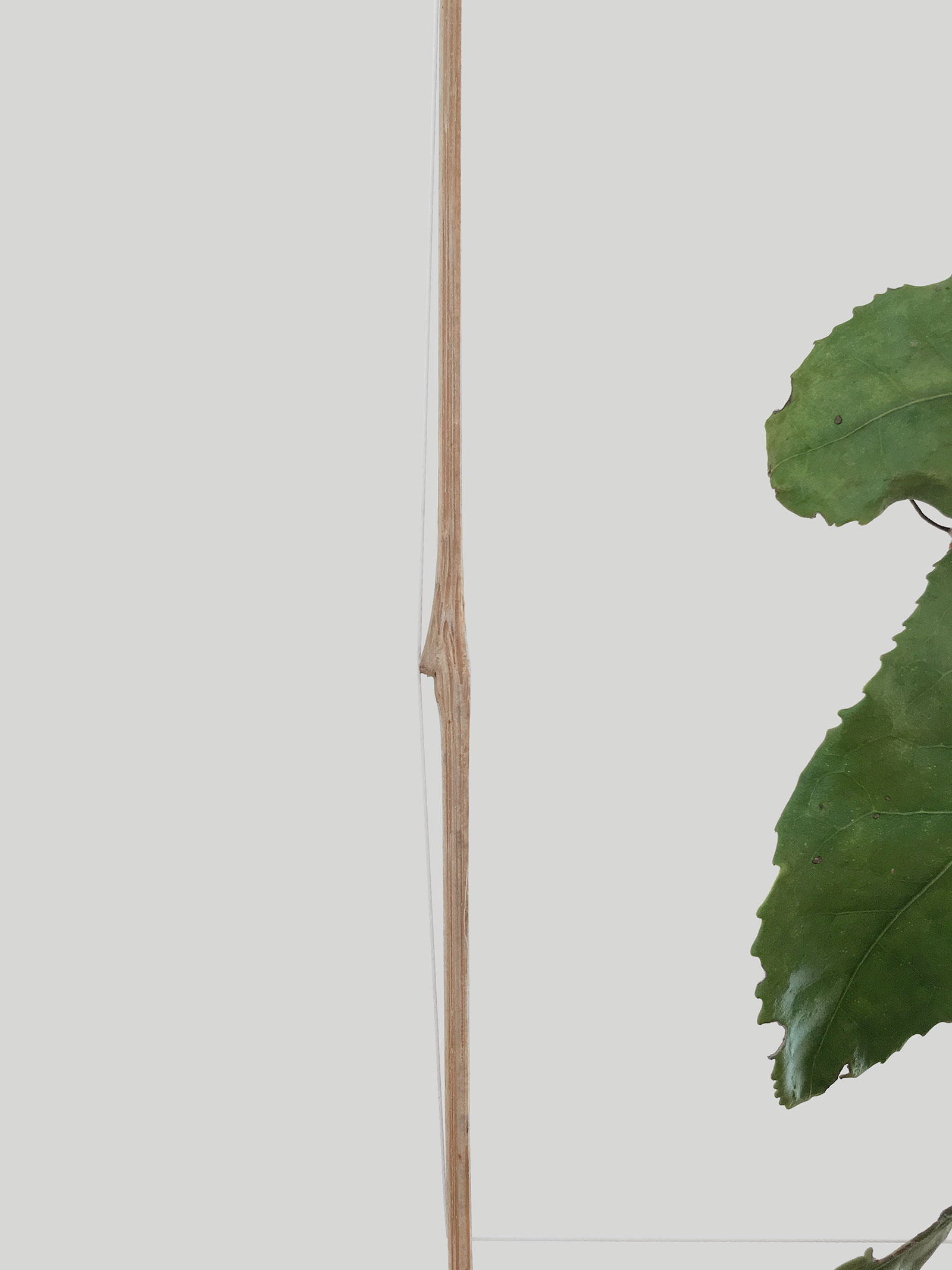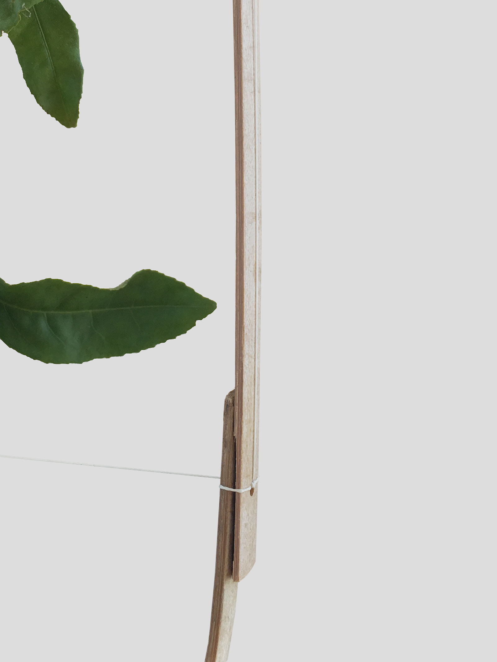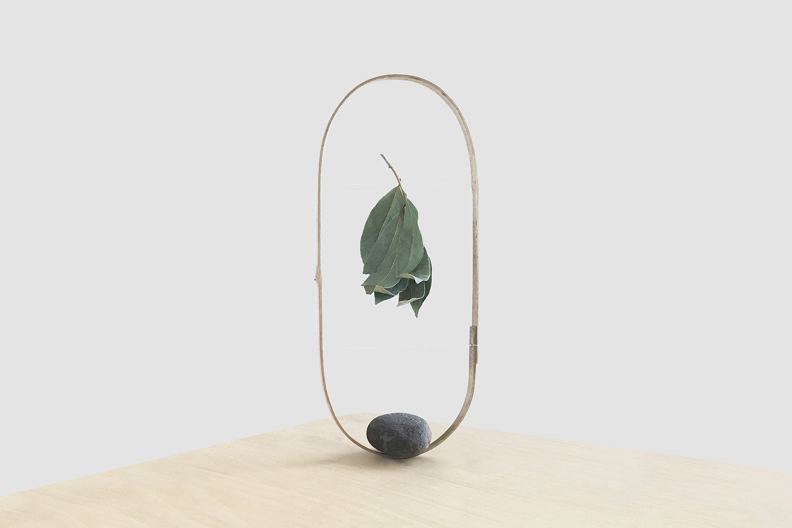 植物がドライとなる過程の形状変化に興味があり、竹に植物を吊る。竹はフレームの役割を含み、植物の観察に焦点を絞る。竹に石を置く、不安定な重心に均衡を探りスタンドができる。風がそよぐと植物の水分を蒸発させる。弾力と張力、不安定と安定、有機と無機、どれも均衡したオーバル型に配置する自然物は構図として成立した。
