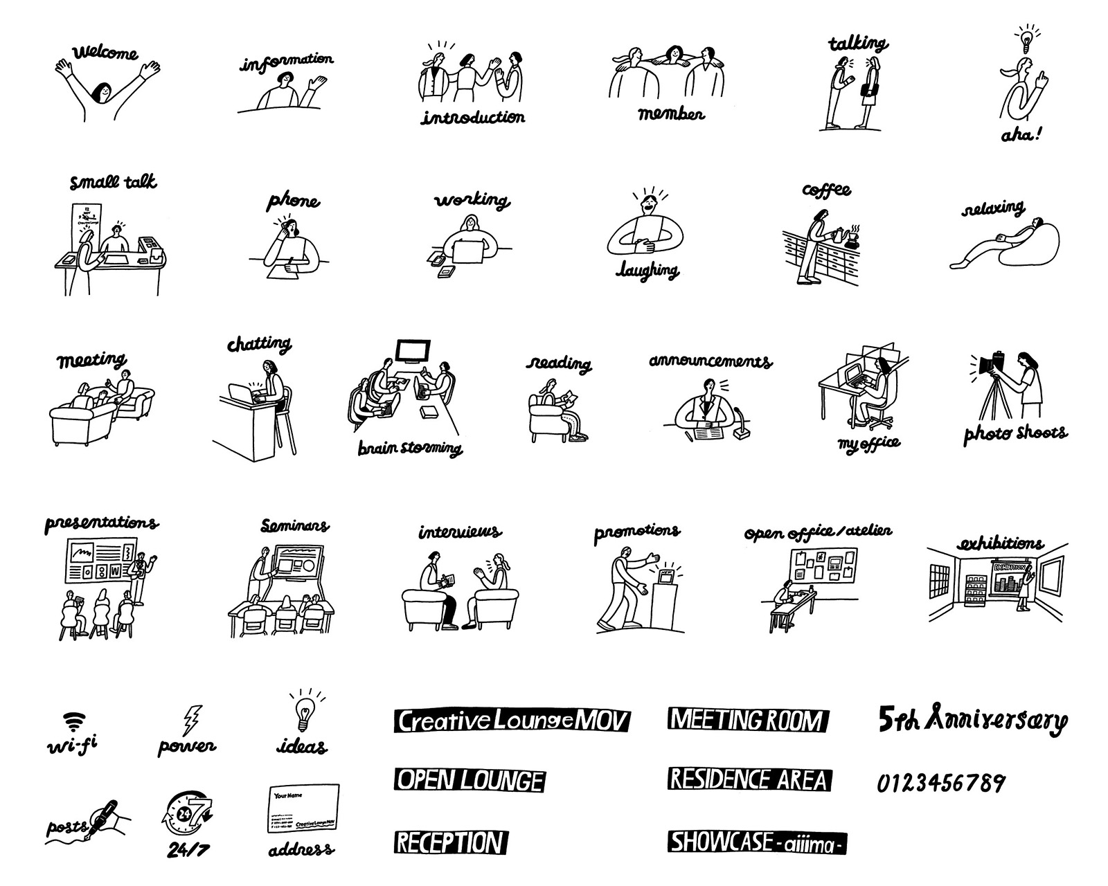 渋谷ヒカリエ 8/ メンバー制のワークスペース Creative Lounge MOV 5周年記念のロゴ制作の依頼だったが一年間しか使用できないものより、コワーキングスペースで働く人々の行動や生態を観察、イラストにして様々なメディアに使用するフレームワークを提案。